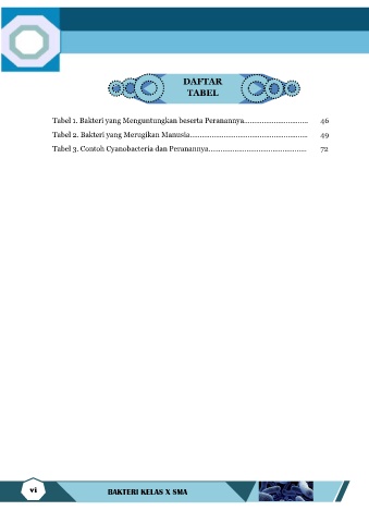 DAFTAR TABEL Tabel 1. Bakteri yang Menguntungkan beserta Peranannya………………………….. 46 Tabel 2. Bakteri yang Merugikan Manusia……………………………………….…………. 49 Tabel 3. Contoh Cyanobacteria dan Peranannya………………………………….……… 72 vi BAKTERI KELAS X SMA c