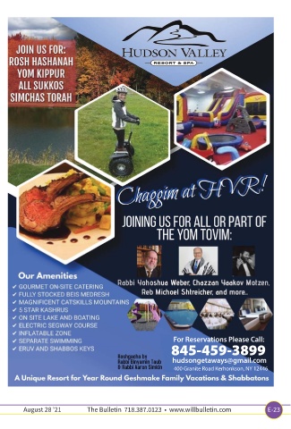 For Reservations Please Call: 845-459-3899 hudsongetaways@gmail.com 400 Granite Road Kerhonkson, NY 12446 August 28 '21 The Bulletin 718.387.0123 • www.willbulletin.com E-23