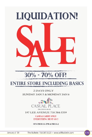LIQUIDATION! LIQUIDATION! 30% - 70% OFF! ENTIRE STORE INCLUDING BASICS 2 DAYS ONLY SUNDAY JAN 5 & MONDAY JAN 6 197 LEE AVENUE 718 384-5359 CASH & CARRY ONLY EVERYTHING MUST GO !! SUN-THUR 11-7PM & FRI 11-2