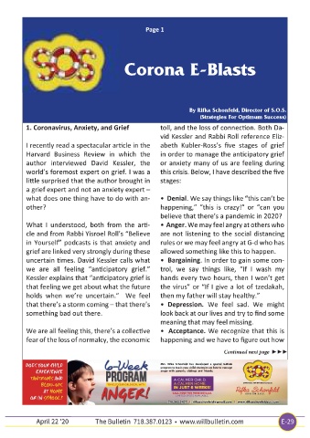Page 1 Corona E-Blasts By Rifka Schonfeld, Director of S.O.S. (Strategies For Optimum Success) 1. Coronavirus, Anxiety, and Grief - - - Denial - Anger Bargaining - Depression. Acceptance.