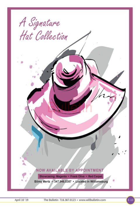 A Signature Hat Collection Bulletin NOW AVAILABLE BY APPOINTMENT 6KRZFDVLQJ 0DJHQWD )UDQN 2OLYH 5HG &DUSHW %OLP\ 0HUW] /RFDWHG LQ :LOOLDPVEXUJ April 10 '19 # 0'' /$) ǚǔǛǻǖǛǚǻǓǔǕǖ ȗ 222ǻ2$'' 0'' /$)ǻ *( E-13