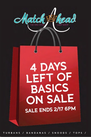 4 DAYS Bulletin LEFT OF BASICS ON SALE SALE ENDS 2/17 6PM T / B A N D A N A S / S N O O D S / T O P S / TU R B A N S / B A N D A N A S / S N OO D S / T O PS / U R B A N S
