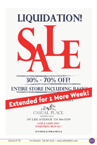 LIQUIDATION! LIQUIDATION! 30% - 70% OFF! ENTIRE STORE INCLUDING BASICS 2 DAYS ONLY SUNDAY JAN 5 & MONDAY JAN 6 197 LEE AVENUE 718 384-5359 CASH & CARRY ONLY EVERYTHING MUST GO !! SUN-THUR 11-7PM & FRI 11-2