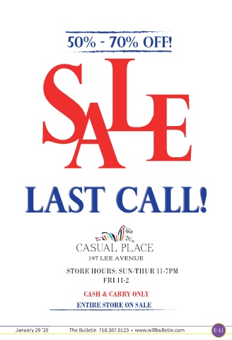 50% - 70% OFF! Last Call! Last Call! 197 LEE AVENUE STORE HOURS: SUN-THUR 11-7PM FRI 11-2 CASH & CARRY ONLY ENTIRE STORE ON SALE