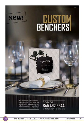 BENCHERS Have us customize the benchers for your simcha according to your theme, taste To Order Call: with a keepsake that everyone will surely 845.492.9644 use and remember. CustomBenchersNY@Gmail.com Y-25