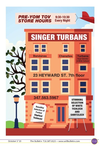 PRE-YOM TOV 9:30-10:30 STORE HOURS Every Night SINGER TURBANS Bandanas Chenelles Bulletin 347.563.5967 STUNNING SELECTION OF WHITE TICHLECH AND SHIRTZLECH
