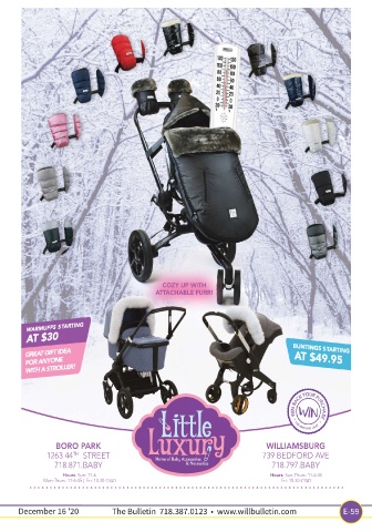 COZY UP WITH ATTACHABLE FURR! BORO PARK WILLIAMSBURG TH 1263 44 STREET 739 BEDFORD AVE 718.871.BABY 718.797.BABY Hours: Sun: 11-6 Hours: Sun-Thurs: 11-6:45 Mon-Thurs: 11-6:45 | Fri: 10:30- Fri: 10:30-