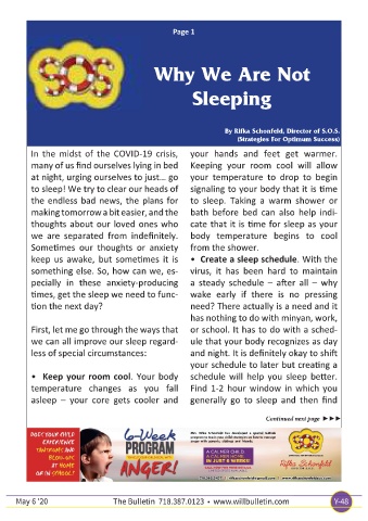 Page 1 Why We Are Not Sleeping By Rifka Schonfeld, Director of S.O.S. (Strategies For Optimum Success) In the midst of the COVID-19 crisis, - Create a sleep schedule - - - - Keep your room cool