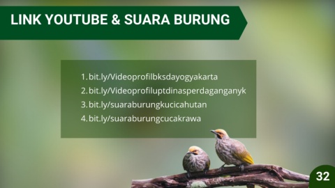 LINK YOUTUBE & SUARA BURUNG 1. bit.ly/Videoprofilbksdayogyakarta 2. bit.ly/Videoprofiluptdinasperdaganganyk 3. bit.ly/suaraburungkucicahutan 4. bit.ly/suaraburungcucakrawa 32