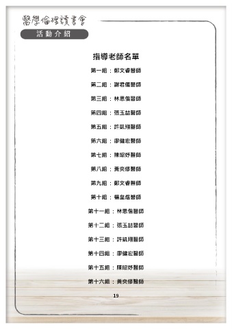 指導老師名單 第一組 : 鄭文睿醫師 第二組 : 謝君儀醫師 第三組 : 林思偕醫師 第四組 : 張玉喆醫師 第五組 : 許凱翔醫師 第六組 : 廖健宏醫師 第七組 : 陳昭妤醫師 第八組 : 黃奕修醫師 第九組 : 鄭文睿醫師 第十組 : 楊皇煜醫師 第十一組 : 林思偕醫師 第十二組 : 張玉喆醫師 第十三組 : 許凱翔醫師 第十四組 : 廖健宏醫師 第十五組 : 陳昭妤醫師 第十六組 : 黃奕修醫師 19