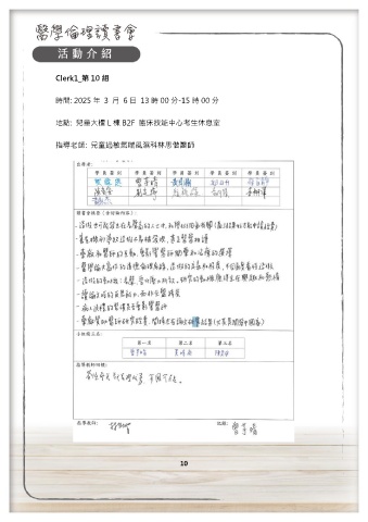 Clerk1_第 10 組 時間: 2025 年 3 月 6 日 13 時 00 分-15 時 00 分 地點: 兒童大樓 L 棟 B2F 臨床技能中心考生休息室 指導老師: 兒童過敏氣喘風濕科林思偕醫師 10
