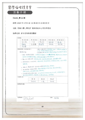 Clerk1_第 12 組 時間: 2025 年 3 月 5 日 13 時 00 分-15 時 00 分 地點: 兒童大樓 L 棟 B2F 臨床技能中心考生休息室 指導老師: 新生兒科許凱翔醫師 12