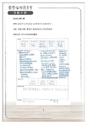 Clerk1_第 5 組 時間: 2025 年 2 月 26 日 13 時 00 分-15 時 00 分 地點: 兒童大樓 L 棟 B2F 臨床技能中心考生休息室 指導老師: 新生兒科許凱翔醫師 5