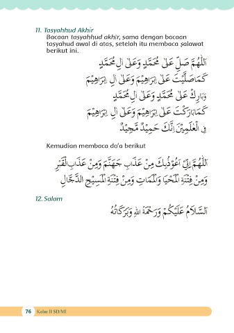 11. Tasyahhud Akh³r Bacaan tasyahhud akhīr, sama dengan bacaan tasyahud awal di atas, setelah itu membaca ¡alawat berikut ini. Kemudian membaca do'a berikut 12. Salam 76 Kelas II SD/MI