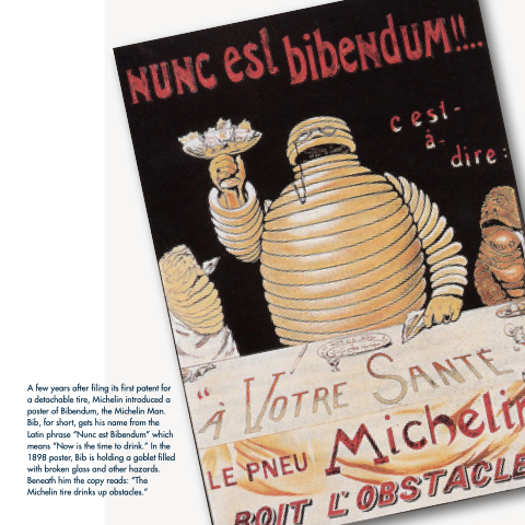 A few years after filing its first patent for a detachable tire, Michelin introduced a poster of Bibendum, the Michelin Man. Bib, for short, gets his name from the Latin phrase “Nunc est Bibendum” which means “Now is the time to drink.” In the 1898 poster, Bib is holding a goblet filled with broken glass and other hazards. Beneath him the copy reads: “The Michelin tire drinks up obstacles.”