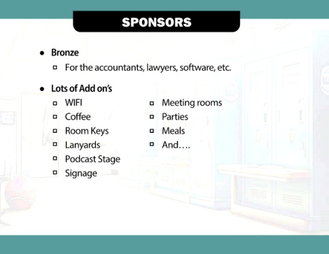 SPONSORS For the accountants, lawyers, software, etc. WIFI Meeting rooms Parties Room Keys Meals Lanyards And…. Podcast Stage Signage