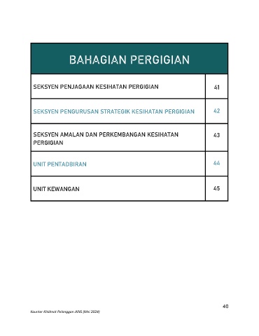BAHAGIAN PERGIGIAN SEKSYEN PENJAGAAN KESIHATAN PERGIGIAN 41 SEKSYEN PENGURUSAN STRATEGIK KESIHATAN PERGIGIAN 42 SEKSYEN AMALAN DAN PERKEMBANGAN KESIHATAN 43 PERGIGIAN UNIT PENTADBIRAN 44 UNIT KEWANGAN 45 40 Kaunter Khidmat Pelanggan JKNS (Mei 2024)