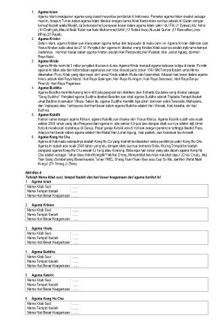 Tulislah Nama kitab suci, tempat ibadah dan hari besar keagamaan dari agama berikut ini
