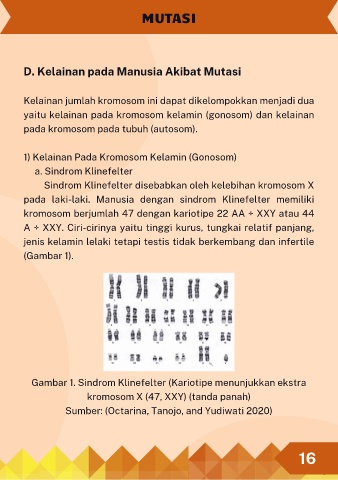 kromosom berjumlah 47 dengan kariotipe 22 AA + XXY atau 44