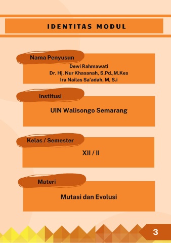 IDENTITAS MODUL Nama Penyusun Dewi Rahmawati Dr. Hj. Nur Khasanah, S.Pd.,M.Kes Ira Nailas Sa’adah, M, S.i Institusi UIN Walisongo Semarang Kelas / Semester XII / II Materi Mutasi dan Evolusi 3