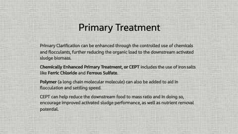 Chemically Enhanced Primary Treatment, or CEPT includes the use of iron salts