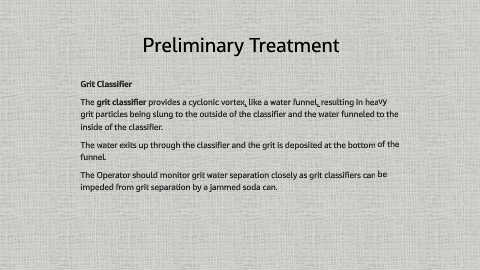 The Operator should monitor grit water separation closely as grit classifiers can be