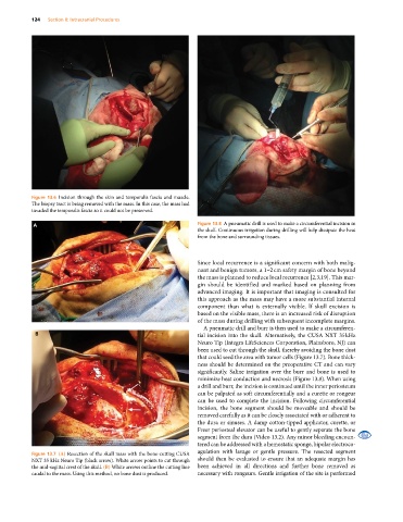 Figure 13.7 (A) Resection of the skull mass with the bone‐cutting CUSA agulation with lavage or gentle pressure. The resected segment