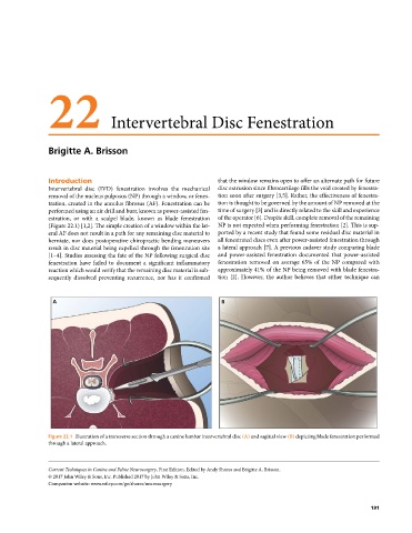Figure 22.1 Illustration of a transverse section through a canine lumbar intervertebral disc (A) and sagittal view (B) depicting blade fenestration performed