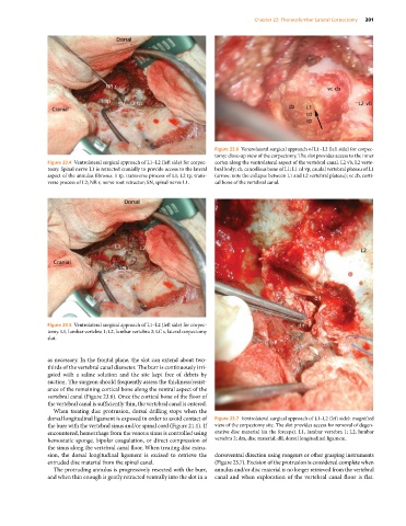 dorsal longitudinal ligament is exposed in order to avoid contact of Figure 23.7 Ventrolateral surgical approach of L1–L2 (left side): magnified