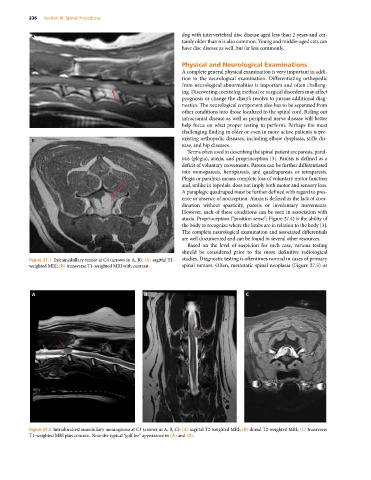 Figure 27.1 Extramedullary tumor at C4 (arrows in A, B): (A) sagittal T1‐ studies. Diagnostic testing is oftentimes normal in cases of primary