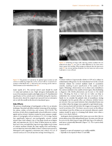 Figure 7.2 The presence of contrast in the epidural space (arrows in A,B) Contrast medium is hyperosmolar relative to CSF and is subject to