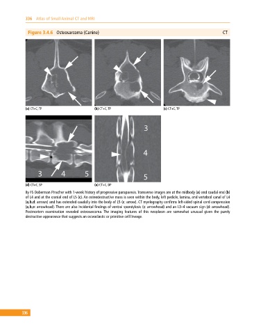 of L4 and at the cranial end of L5 (c). An osteodestructive mass is seen within the body, left pedicle, lamina, and vertebral canal of L4