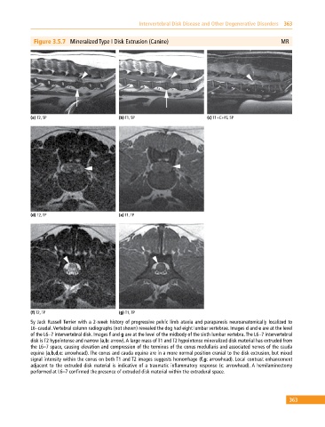 equina (a,b,d,e: arrowhead). The conus and cauda equina are in a more normal position cranial to the disk extrusion, but mixed