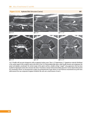 (c,f: arrowhead). Ventral slot decompression surgery was performed and a large volume of clear fluid was encountered along with more