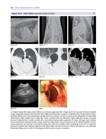 lobar bronchus tapers abruptly near its origin (d,e: arrow), consistent with lung lobe torsion. Right middle lobe volume is increased