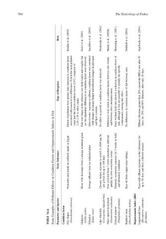 TABLE 16.6 Parameter and Species Condition factor Nile tilapia (Oreochromis niloticus) Gudgeon (Gobio gobio) Zebrafish (Danio rerio) Lake whitefish (Coreogonus clupeaformis) Three-spined stickleback (Gasterosteus aculeatus) Fathead minnow (Pimephales promelas) Rainbow trout (Oncorhynchus mykiss) Hepatosomatic index (HIS) Largemouth bass (Micropterus salmoides floridanus)
