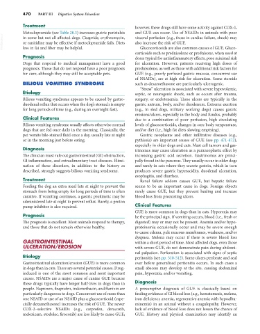 Metoclopramide (see Table 28.3) increases gastric peristalsis and GUE can occur. Use of NSAIDs in animals with poor