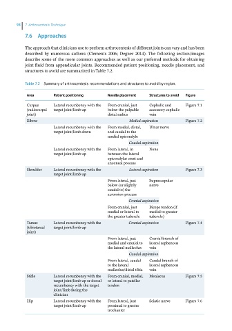 Table 7.2 Summary of arthrocentesis recommendations and structures to avoid by region.