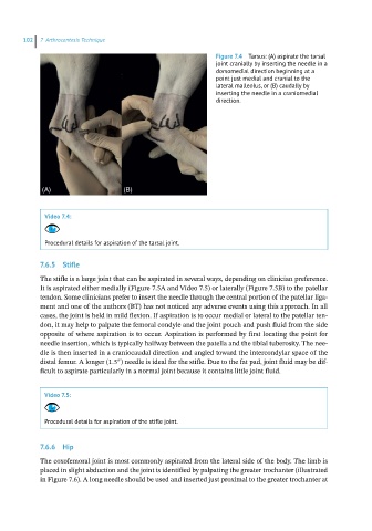 It is aspirated either medially (Figure 7.5A and Video 7.5) or laterally (Figure 7.5B) to the patellar