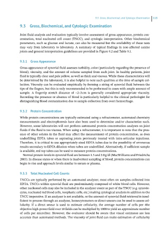 Joint fluid analysis and evaluation typically involve assessment of gross appearance, protein con-