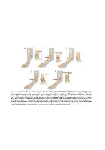 ulnocarpal ligaments only; (E, F) injury at the level of the middle carpal joint (red arrow) with proximal displacement of the accessory carpal bone and ulnar