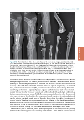 dog; (E) note the sesamoid of the supinator muscle (white arrow), a normal structure that is visible in some