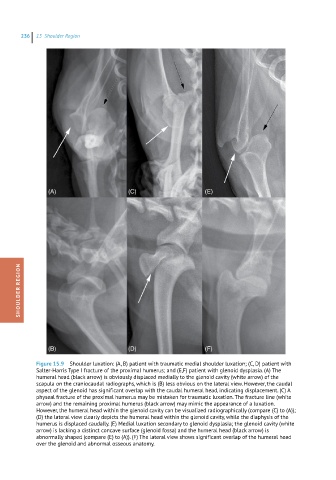 humerus is displaced caudally. (E) Medial luxation secondary to glenoid dysplasia; the glenoid cavity (white