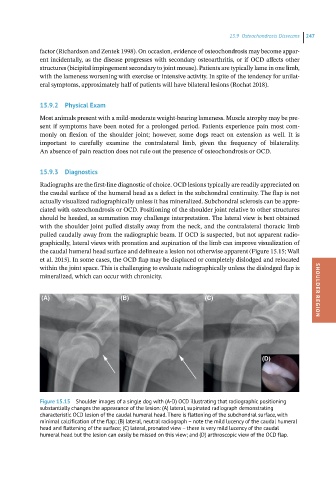 Figure 15.15  Shoulder images of a single dog with (A-D) OCD illustrating that radiographic positioning