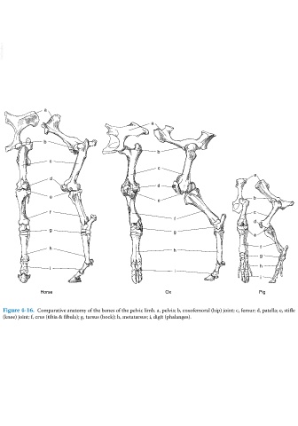 Figure 4-16. Comparative anatomy of the bones of the pelvic limb. a, pelvis; b, coxofemoral (hip) joint; c, femur; d, patella; e, stifle