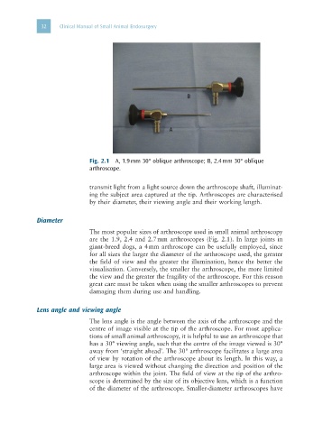Fig. 2.1 A, 1.9 mm 30° oblique arthroscope; B, 2.4 mm 30° oblique