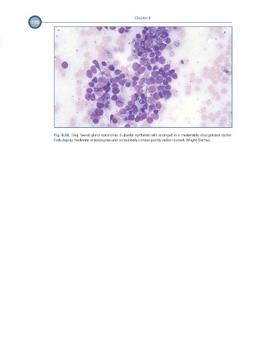 er 8 Chapt 110 VetBooks.ir Fig. 8.26. Dog. Sweat gland carcinoma. Cuboidal epithelial cells arranged in a moderately disorganized cluster. Cells display moderate anisokaryosis and occasionally contain poorly visible nucleoli. Wright-Giemsa.