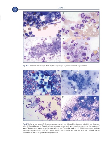 Fig. 6.12. Bacteria. (A) Cocci. (B) Rods. (C) Actinomyces. (D) Mycobacteria spp. Wright-Giemsa.