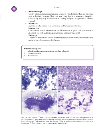 Fig. 7.1. Dog. Variants of follicular cyst. (A) Polygonal anucleated squamous epithelial cells suggestive of an