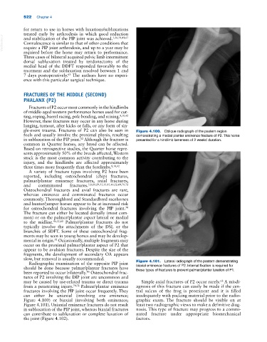 gle‐event trauma. Fractures of P2 can also be seen in Figure 4.100. Oblique radiograph of the pastern region